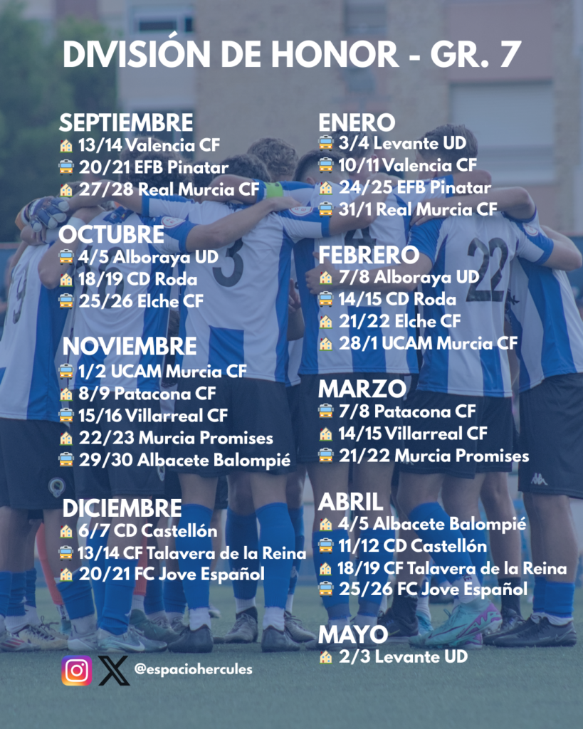 Primera prueba dura para el Juvenil A, el Valencia. El actual campeón será el rival ante el que debute el Hércules de Dani Palao. El Pinatar, club murciano recién ascendido, será el primer desplazamiento que realice el equipo blanquiazul. Los herculanos terminarán la liga el primer fin de semana de mayo recibiendo en la Ciudad Deportiva Antonio Valls al Levante.